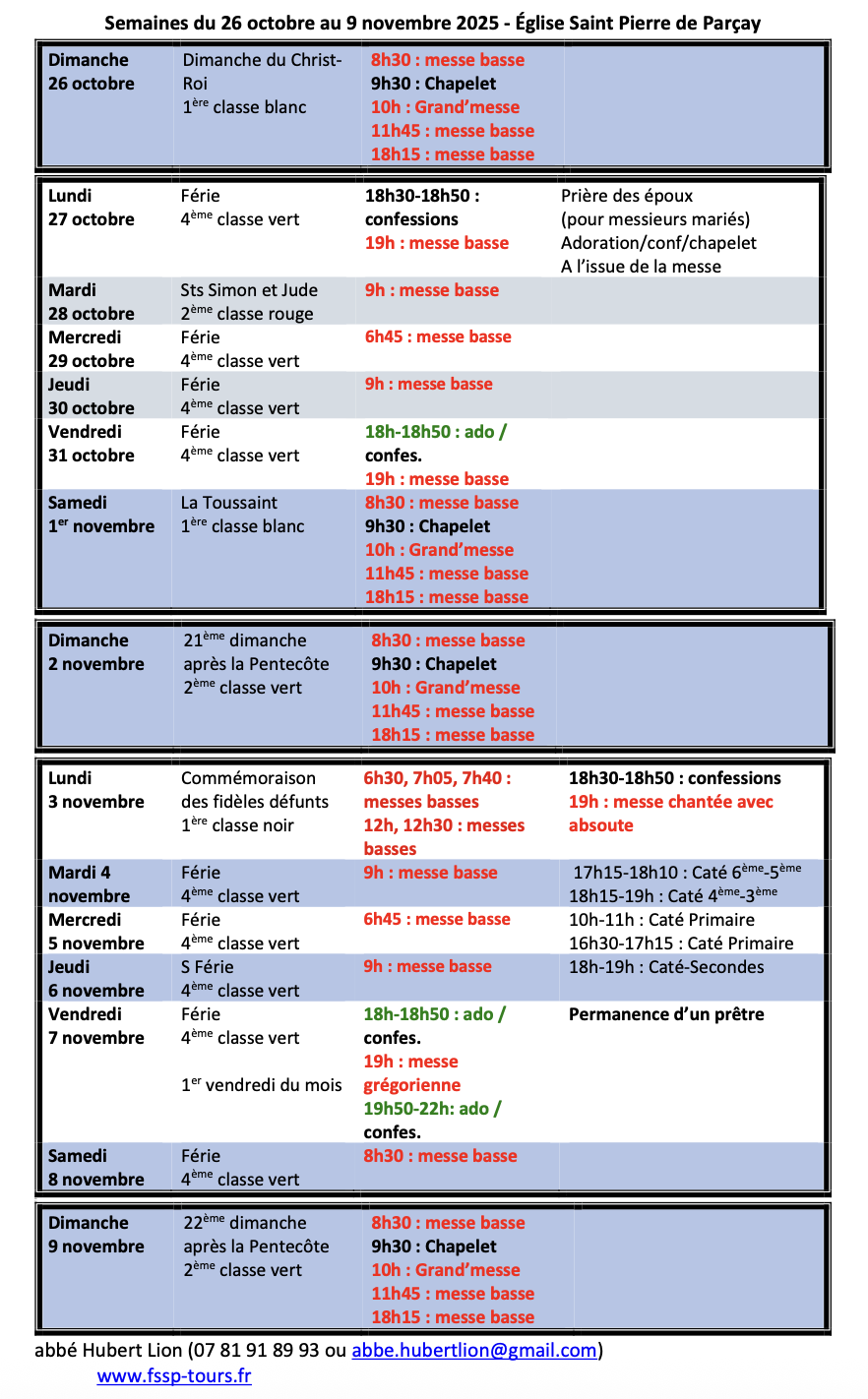 - Catéchisme – Fin des catéchismes le 10-11 juin inclus. Pour les inscriptions pour l’année 2025-2026 : Les renseignements sont sur le site internet. Préinscriptions avant le mardi 23 septembre. https://www.fssp-tours.fr/formation/311-2/. Finalisation sur place au centre paroissial de SPV le mercredi 24 septembre de 10h à 12h, de 16h30 à 18h. La rentrée des catéchismes qui se seront donnés à Tours-Centre tout au long de l’année aura lieu du mardi 30 septembre au jeudi 2 octobre, puis vendredi 10 octobre (1ère et Terminales).