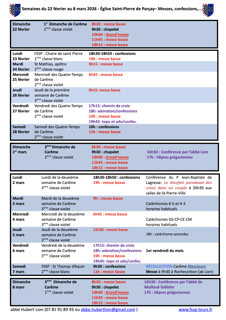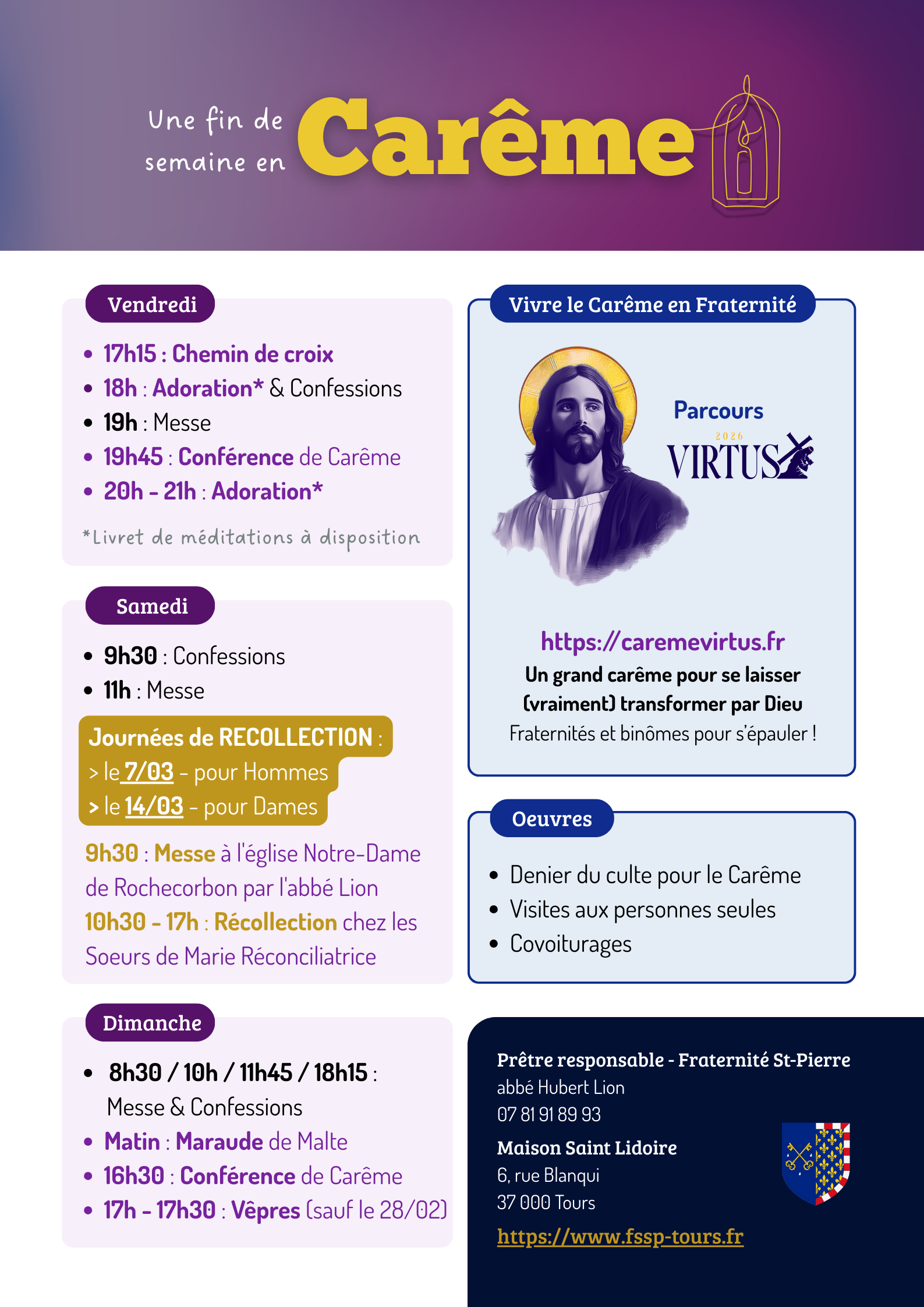 Pour clore ce mois de prières, la Maison Générale, nos deux séminaires, la Province d’Amérique du Nord et les Districts enverront des représentants cette année à Fatima, les 10 et 11 février 2026. Ils y renouvelleront la consécration de l’ensemble de la Fraternité à Notre-Dame devant le lieu des apparitions.