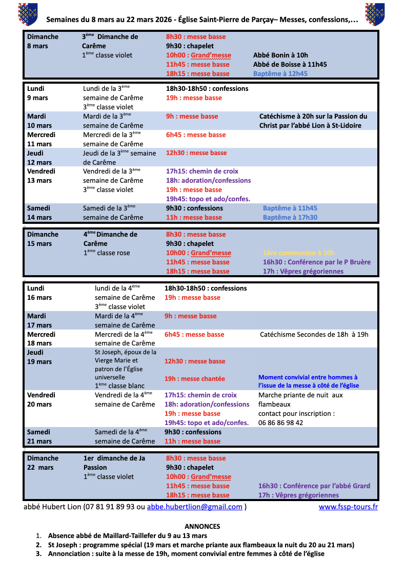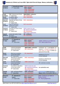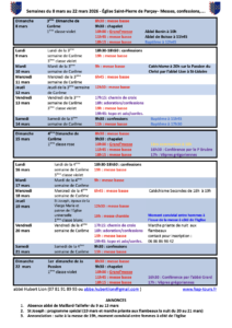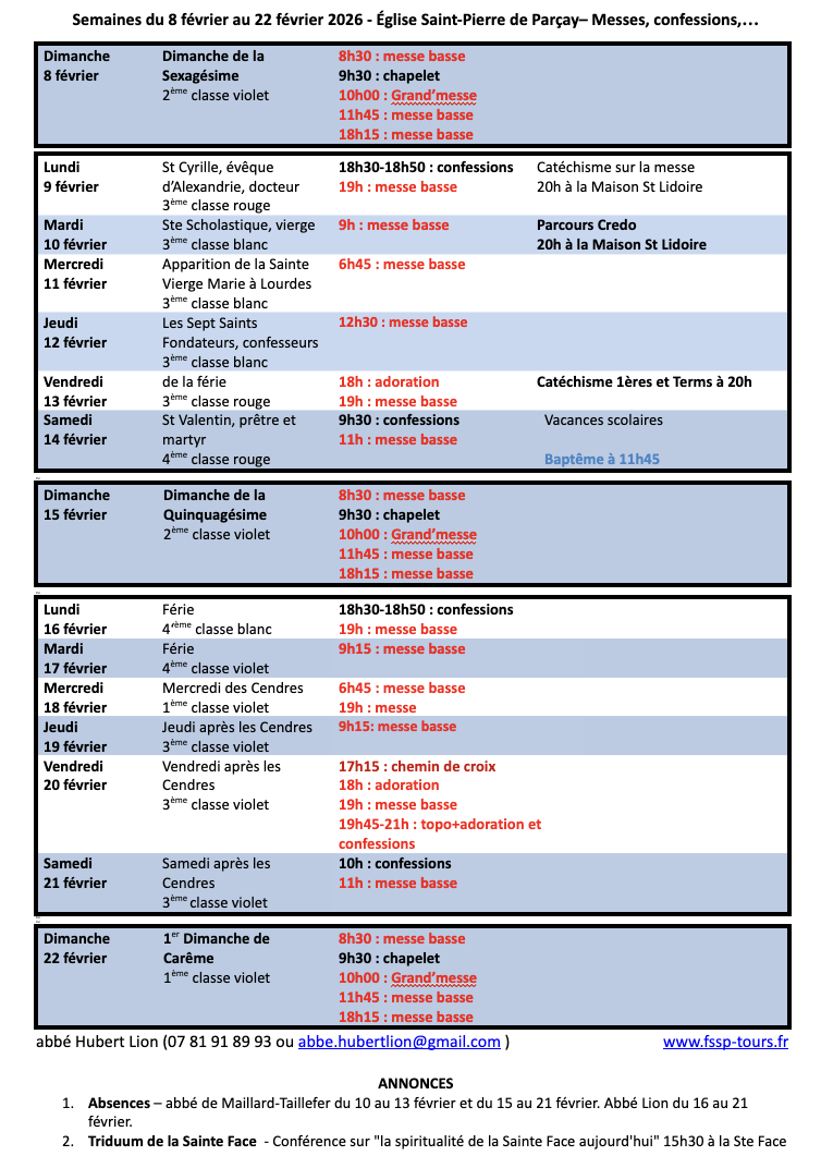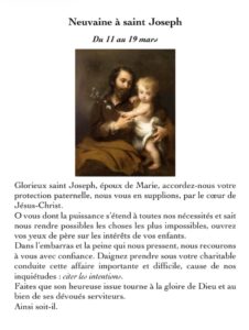 Un « trentain » de prières préparatoires au renouvellement de la consécration de la Fraternité au Cœur Immaculé de Marie est organisé cette année. Il commencera le dimanche 11 janvier pour se terminer le 11 février, jour anniversaire où l’on renouvellera publiquement l’acte de consécration. Le « trentain » de prières préparatoire consistera en la récitation quotidienne d’une dizaine de chapelet et du « Souvenez-vous ».