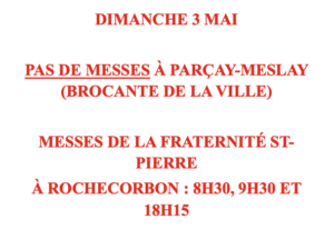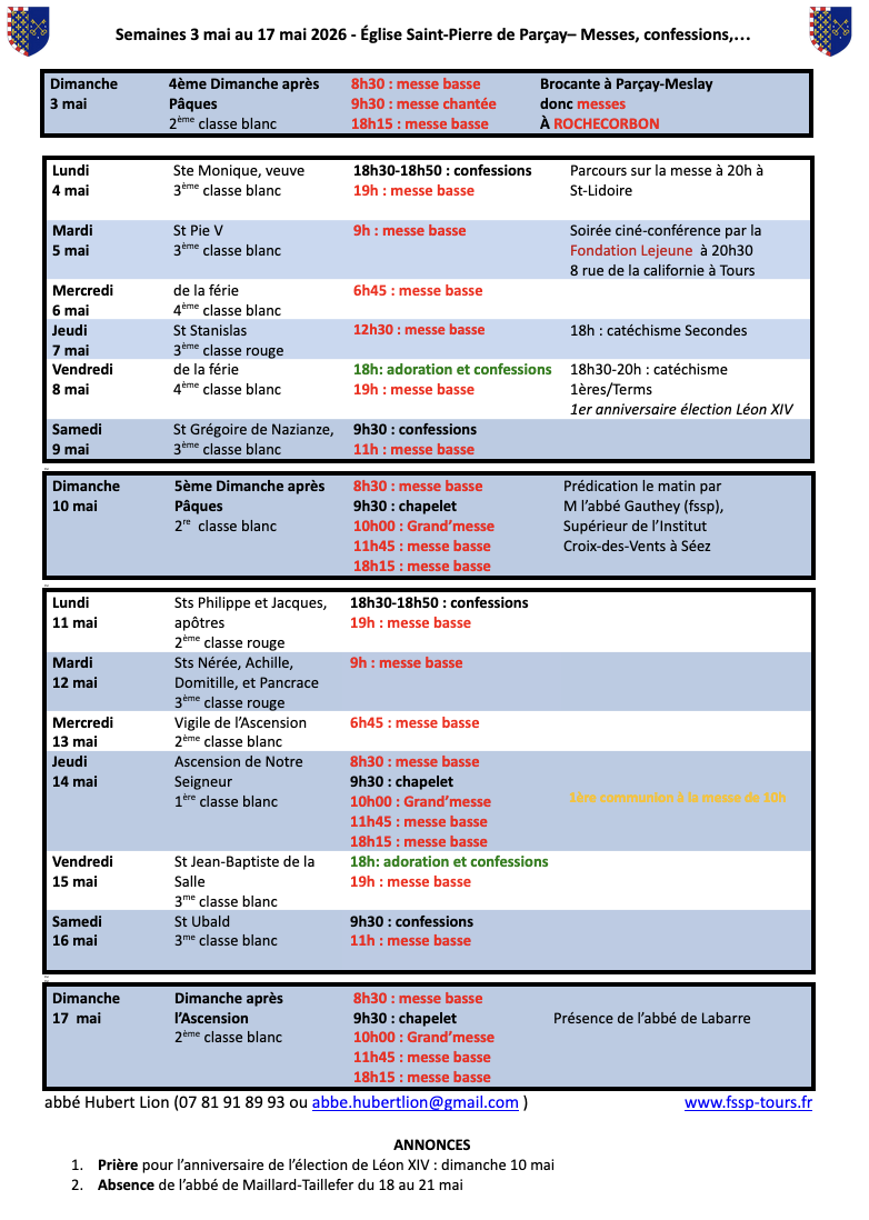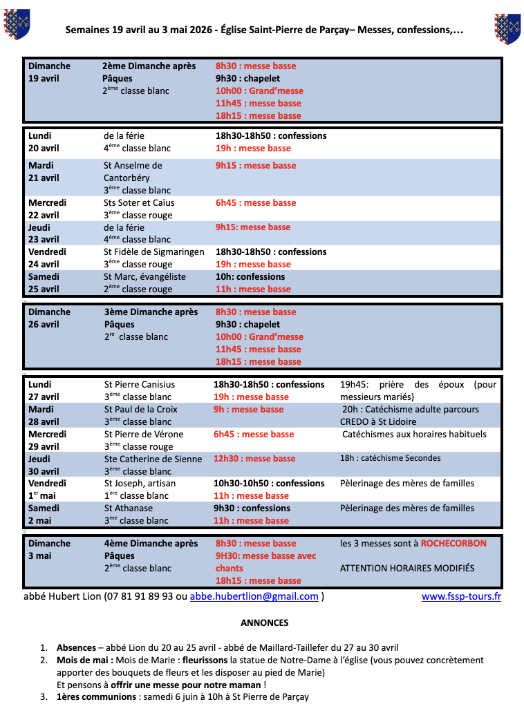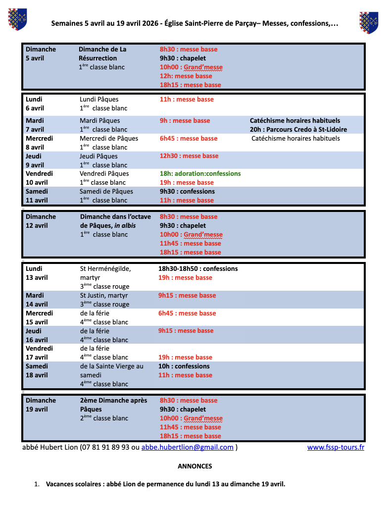 Les messes des Rameaux et de Pâques, ainsi que lundi, mardi et mercredi saints ont lieu à l’église St-Pierre de Parçay (1 Pl. de l’Église, 37210 Parçay-Meslay).