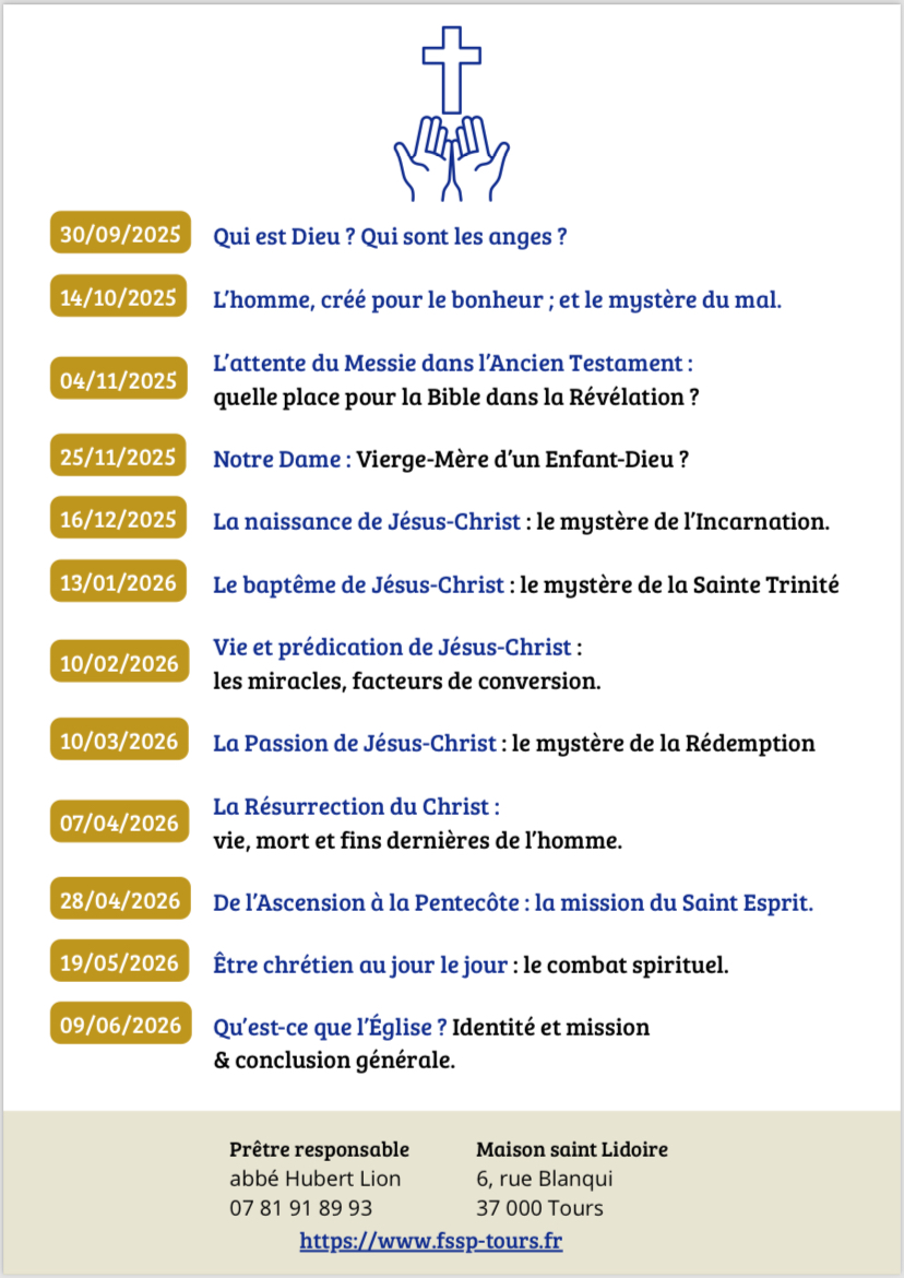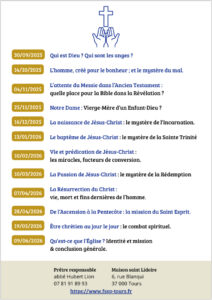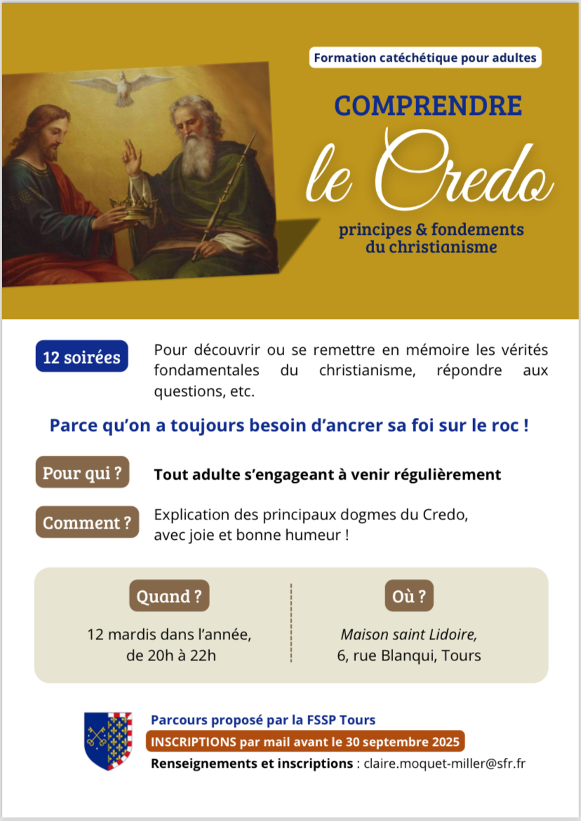 1- Parcours Credo: formule catéchétique « pour les nuls » qui reprend toute la doctrine depuis le début, le mardi soir de 20h30 à 22h00 à la maison Saint Lidoire de Tours (6 rue Blanqui).