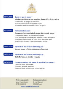2- Parcours La Messe: sur ce qu’est la Messe, la doctrine catholique appuyée sur l’Écriture et la Tradition, explications des rites de la Messe, de l’histoire de la Messe, et de comment assister à la Messe.