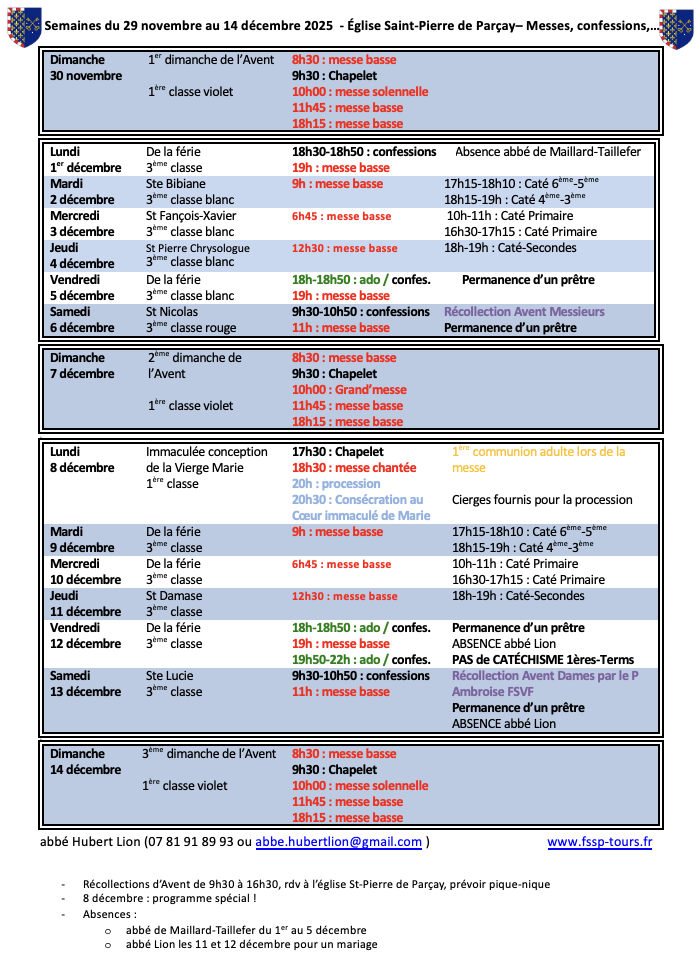 Dimanche 07/09 à 10h15: messe solennelle d’accueil de l’abbé Lion à St-Pierre-Ville. Le Supérieur du District de France de la Fraternité St-Pierre, monsieur l’abbé de Giacomoni, sera fraternellement présent. A l’issue de la messe aura lieu un apéritif d’accueil jusqu’à 12h15.